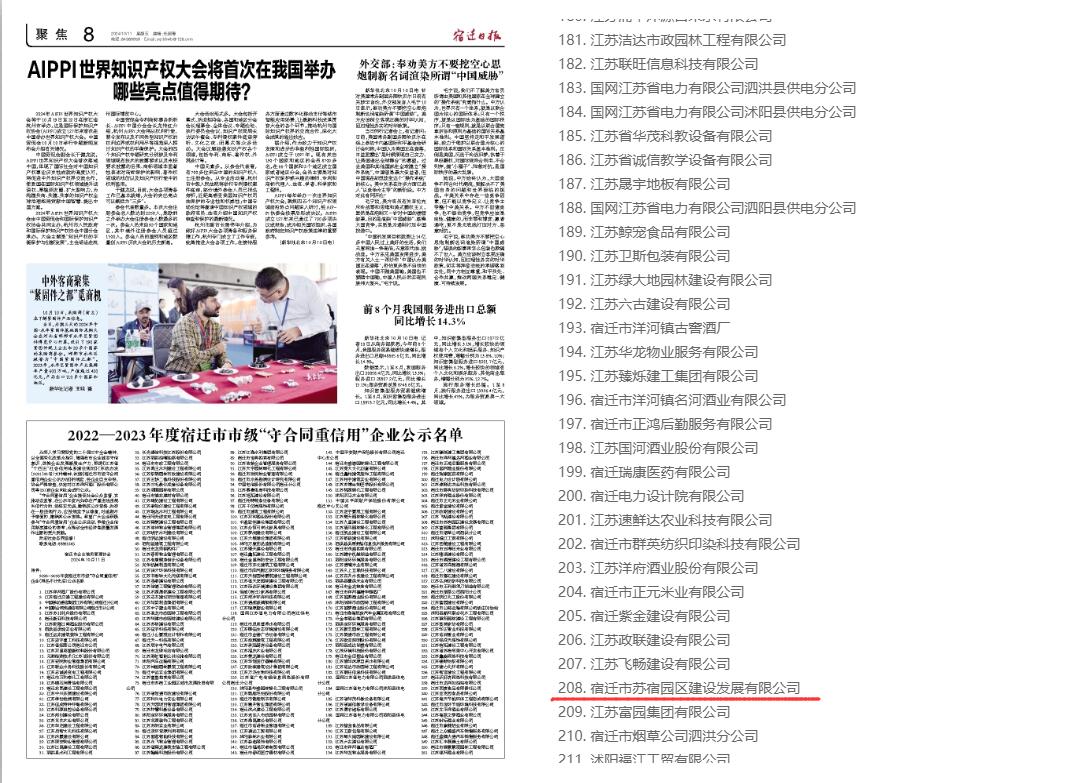 近日,宿遷市企業(yè)信用管理協(xié)會(huì)發(fā)布2022-2023年度宿遷市市級(jí)“守合同重信用”企業(yè)名單公示,建發(fā)公司再度榮列企業(yè)公示名單。