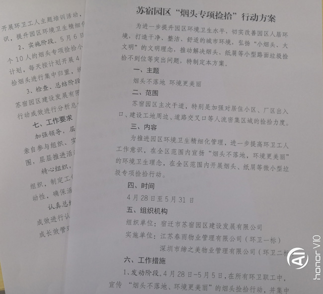 為了確保“煙頭專項(xiàng)撿拾”行動(dòng)順利開(kāi)展,公司結(jié)合園區(qū)實(shí)際,精心籌劃,制定了《蘇宿園區(qū)“煙頭專項(xiàng)撿拾”行動(dòng)方案》。