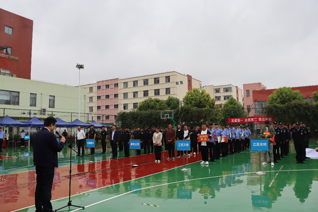 本次技能競賽科目分別是隊(duì)列展演、消防兩盤水帶連接、消防快速滅火操。隨著比賽“開始”口令的下達(dá),四支隊(duì)伍共70名參賽隊(duì)員身著保安制服,以飽滿的精神、高昂的氣勢、整齊的步伐以及響亮的口號震撼亮相。稍息、立正、敬禮與禮畢、正步走、齊步走……他們用整齊劃一的動作、干凈利落的操作表演、扎實(shí)的軍事素養(yǎng),贏得了現(xiàn)場觀眾和評委的高度贊揚(yáng)和肯定!最終江蘇萬楊保安服務(wù)有限公司和江蘇天時物業(yè)管理有限公司獲評團(tuán)體第一名和第二名。
