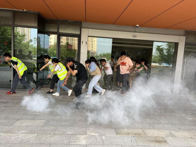 隨著警報聲拉響,模擬演練生產(chǎn)力中心出現(xiàn)火情,現(xiàn)場巡查員發(fā)現(xiàn)火情后立即上報,啟動消防應(yīng)急預(yù)案,指揮組、滅火組、疏散組、救護組、警戒組、保障組等成員按照分工,有條不紊地組織義務(wù)消防隊員開展撲救火災(zāi)、現(xiàn)場救護傷員、疏散樓內(nèi)職工、現(xiàn)場警戒等工作。